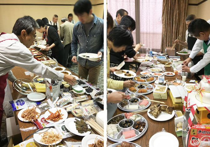 11月6日(日)、博多グリーンホテル2号館 2F 第6〜7会議室にて出席者22名の参加で合同支部会が開催されました。今年のおせちは、全体的に甘みを抑えて素材の旨味を生かしたものが人気でした。創健社の大根餅が柔らかくて美味しかったです。ムソーからは、ノースカロライナのソフトあたりめなどが好評でした。健康フーズの一番人気はタラバガニでした。